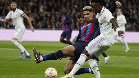 Ante la baja forma de Benzema, el Madrid le ha entregado las llaves de su ataque a Vinicius. El plan de Ancelotti es provocar continuamente situaciones en las que el brasileño pueda encarar desde su banda izquierda y, desde ahí, esperar a que pasen cosas. El Barcelona lo sabía y por eso situó en el lateral derecho a Ronald Araujo, quizás el mejor defensa del mundo. El uruguayo es implacable en los duelos y sus enfrentamientos con el brasileño pueden marcar una época.