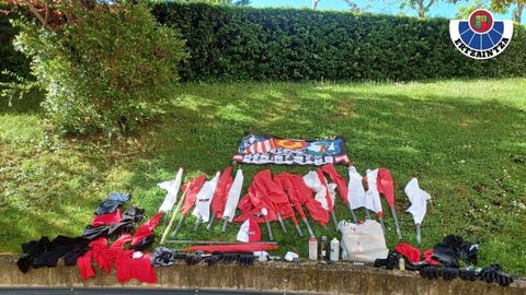La Ertzaintza ha intervenido para evitar cualquier enfrentamiento y ha identificado a los 118 ultras visitantes, a los que ha incautado el material que llevaban entre sus pertenencias, como banderas con palos de PVC, palos de madera, pasamontañas, esprays, guantes con nudillos reforzados y rodamientos metálicos introducidos en calcetines, entre otros objetos peligrosos, además de diversa simbología ultra.