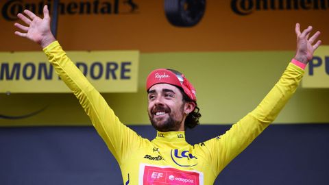 Ganaba distancia la fuga y entonces entendió Ben Healy, ganador en solitario en Vire en la sexta etapa, que esta vez la historia que debía escribir no iba a ir de levantar los brazos en la meta sino de recoger el leoncito del Credit Lyonnais en el podio, que la caza menor está bien, pero hay cosas más importantes, como vestirse de amarillo. Así que se puso en cabeza, sin importarle no recibir ni un relevo, para mantener la diferencia o aumentarla, a sabiendas de que cualquier arreón final de Pogacar, Vingegaard y su corte celestial, podrían acabar con su nuevo sueño. Incansable, con esa forma de pedalear que agota a quien le observa, mirando de soslayo la muchedumbre que abarrota las cunetas, Healy trabaja y trabaja, y nunca desiste, aunque en el comienzo de Le Mont-Doré, ve cómo Simon Yates, ganador del Giro, una de las bestias del Visma y del Tour, le sobrepasa para ganar la etapa. Y detrás, Ben O'Connor, y luego Arensman. Pero él está disputando una cronoescalada, y así consigue superar al primero cuando desfallece, llegar tercero y sumar cuatro segundos de bonificación.