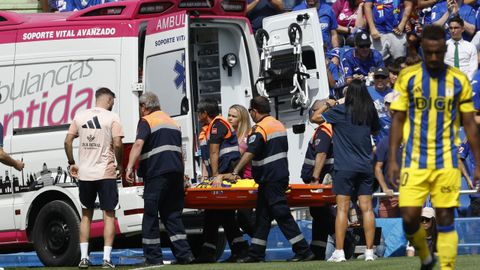 El lateral derecho del Real Oviedo, indiscutible para Paunovic, comenzó a sangrar, se intentó levantar y volvió a caer al césped mareado; después le pusieron el collarín, salió del rectángulo de juego en camilla y le evacuaron en ambulancia al hospital, donde pasó la noche.