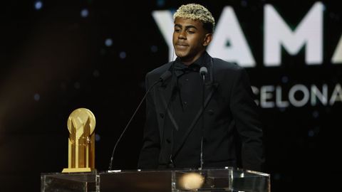«Muchas gracias por el premio. Es un orgullo estar aquí otra vez. Quería agradecer a mi club y a la selección porque sino no podría estar aquí y también a mi familia. Espero seguir trabajando y conseguir muchos mas», dice un Lamine Yamal más serio que el año pasado. «No sé si estoy listo para el gran trofeo (se ríe). A lo mejor nos vemos luego.