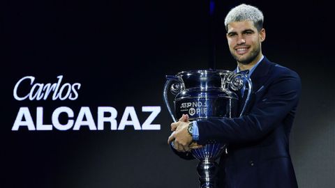 Alcaraz recibió el viernes el trofeo que le acredita como mejor jugador del año 2025, un logro por el que se mostró «muy contento y orgulloso», recalcando que trabaja «muy duro todos los días» para conseguirlo, y agradeciendo también a los aficionados de todo el planeta, que le transmiten mucho «cariño».