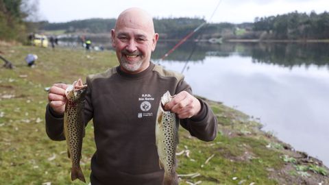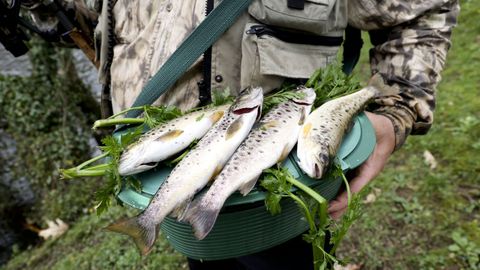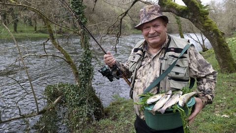 Manuel Gil, pescador y responsable de la Escola de Pesca de la Sociedade de Lalín: «A tempada empezou como se esperaba: augas frías, ríos altos e troitas inactivas», resume. «Como todos os anos cando veñen invernos de moita choiva, en marzo a pesca comeza cos ríos moi altos de caudal e con baixa temperatura da auga, polo que as troitas están metidas no fondo», explica. «Algunha entra, pero rascando o fondo. Os cebos que mellor funcionaron foron, nos artificiais, as ninfas, que van derivando polo fondo do río, e nos naturais, a miñoca, poñéndolle plomos e pescando ao fondo», cuenta. «A troita non sube a comer, hai que ir ao fondo de todo. Tamén é o bonito da pesca. Non todo vai ser que pique fácil», dice el lalinense, que consiguió extraer alguna trucha del río Arnego.