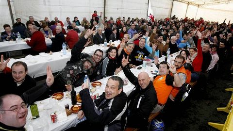 Tras el almuerzo, el humorista estradense Pablo Chichas animó con su monólogo la sobremesa. Con el estómago lleno y el espíritu optimista, los comensales se lanzaron a la pista de baile. Al son de las orquestas Solara y Ritmo Joven intentaron rebajar las calorías del copioso almuerzo.