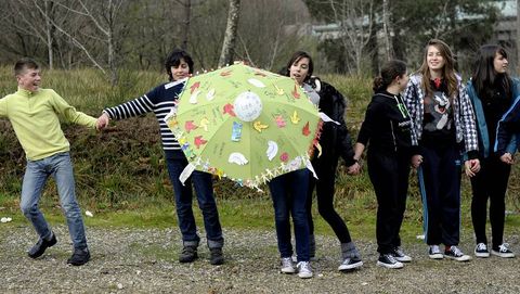 1El mal tiempo no pudo con las actividades que la mayoría de los centros de la zona celebraron ayer con motivo del Día de la Paz. En el IES número 1 de A Estrada lucieron los paraguas decorados en la escenificación de una cadena de la paz que usaba los paraguas de escudos contra potenciales ataques y que llenaron el centro de color. Los alumnos realizaron también una suelta de palomas y hoy las actividades continúan con un encuentro con la diseñadora Rosa Herraiz. Una iniciativa que cierra el mes de los usuarios de la biblioteca en los que se incluye la entrega de los premios U10 y L10, al usuario 10 y al lector 10, respectivamente.
