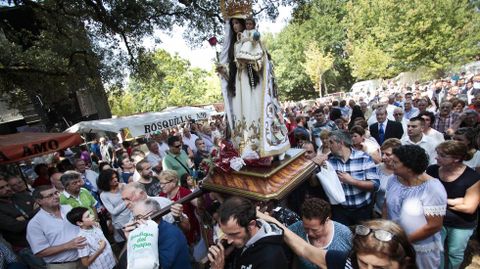Un año más, los chiringuitos asfixiaron el santuario y dejaron poco espacio para el paso de la procesión, que antaño discurría hasta el cruceiro y ahora ha recortado el itinerario por la creciente instalación de puestos de feria. Al párroco, Jesús Mayo, le gustaría rodear el atrio con un pequeño podio para separar la zona religiosa de los puestos de venta y permitir el paso holgado de la procesión. Pero eso requiere complejas negociaciones con Patrimonio y de momento no ha podido ser.
