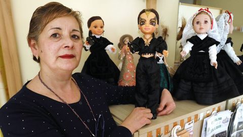 Teresa García explica que comenzó esa vertiente textil en miniatura hace unos diez años en su localidad natal de Valdeorras, cuando una madre le encargó sendas muñecas tuneadas de gallegas para sus dos hijas, que bailaban en la agrupación de música y baile tradicional Abertal, al que ella misma lleva años haciéndoles sus trajes. «Lo disfruto mucho y aunque forma parte de mi trabajo, esto es mi hobby», cuenta la costurera que lleva toda la vida manejando la aguja y el dedal con destreza y pasión. «Mi bisabuela era sastra y yo ya le hacía los vestidos a mis muñecas de trapo», recuerda la profesional que en su establecimiento también hace muñecas-joyero, bolsas personalizadas y otras labores con las que trata de paliar la merma de los negocios atacados por la pandemia y las ventas por internet.