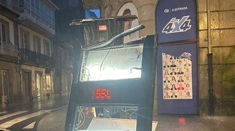 El temporal de lluvia y viento que azotó la comarca este jueves provocó el desplome del panel publicitario que estaba instalado en la plaza de la Farola, en la esquina con la calle Peregrina. El panel se utilizaba como espacio de propaganda publicitaria y ofrecía además información horaria y de la temperatura registrada.