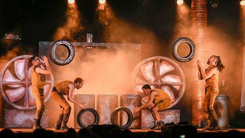 Los asistentes a Festival Internacional de Percusión que se celebra en Merza pudieron disfrutar del espectáculo Trash! de la compañía Toompak, producido por Yllana. A lo largo de una hora cautivaron al público empleando como instrumentos bidones, paraguas, latas, botellas de plástico y hasta pelotas de baloncesto usadas para crear una banda sonora llena de ritmo. Ayer estaba prevista la actuación de Abraham Cupeiro y hoy la de Drumshow con Pepe Blanco y Miguel Lamas.