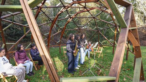 El IES Pintor Colmeiro inauguró ayer una estructura geodésica realizada el pasado curso en un proyecto y convertida en un lugar de lectura al aire libre, por iniciativa de la biblioteca y el EDL, bautizado como Espazo lector Luisa Cuesta Gutiérrez. foto adrián Freiría