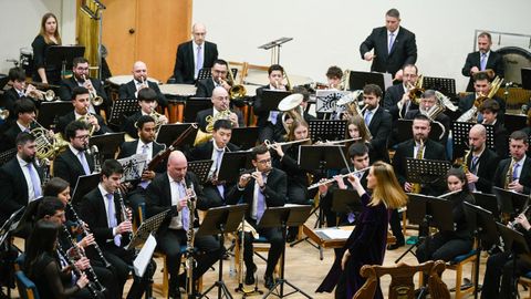 La Banda de Lalín ofreció en la sala Tuno Valdés del Auditorio el tradicional Concerto do Cocido que este año contó como directora invitada a la murciana, María Isabel Rubio, que fue hace años directora de la formación lalinense. Un reencuentro que los músicos celebraban estos días ya con los ensayos previos al concierto. Toda la familia de la banda expresaba estos días su cariño a la que fue su directora y con la que se alegraban de volver a tocar en una ocasión tan especial como este concierto. foto Miguel Souto