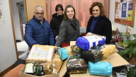 El director de Cáritas Parroquial de A Estrada, José Manuel Vázquez, junto a Lourdes Tejedor, recibieron ayer la entrega de sesenta kilos de productos recolectados durante el Bicientroido. La concejala de Xuventude, Lucía Seoane, junto a la secretaria de la alcaldía, Rocío Blanco, acudieron con los alimentos no perecederos. foto m. souto