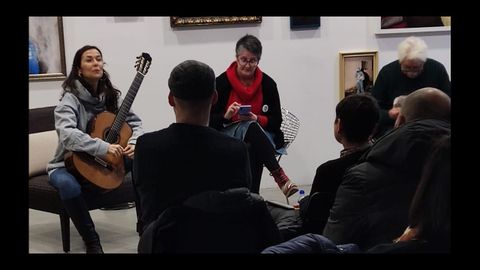 La galería Dispara de A Estrada acogió ayer la presentación de la obra Galizan Nation. Uma distopia kpop, de Isabel Rei Sanmartín. En la presentación, que acabó con un pequeño recital de guitarra clásica, participaron la propia autora y la escritora estradense Susana Sanches Arins.