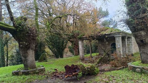 Uno de los enormes carballos que dan sombra a la Carballeira da Saleta, en Loimil (A Estrada), ha cedido al temporal de los últimos días. Parte del árbol se ha desprendido y ha acabado desplomándose sobre el tejado de la capilla de A Saleta. Las ramas han destrozado algunas tejas. No obstante, el tejado del edificio ya lleva tiempo maltrecho. Está parcialmente cubierto de vegetación y presenta un hundimiento en el centro. En la carballeira también hay varios robles poco saludables, algunos con el interior hueco.