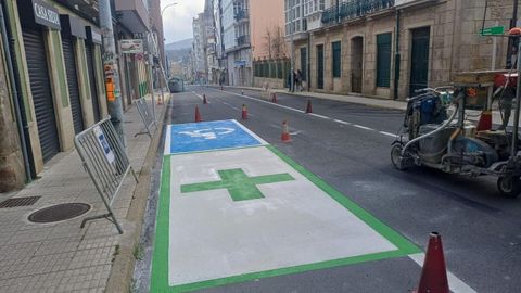 El Concello de A Estrada emprendió este martes el cambio de la señalización horizontal en el tramo de Pérez Viondi que va de Benito Vigo a la Farola y en la rúa San Paio. En ambos casos, el aparcamiento ha quedado configurado en el margen derecho. En Pérez Viondi, en el extremo más próximo a la Farola se han habilitado una plaza exclusiva para usuarios de la farmacia y otra para personas con movilidad reducida.