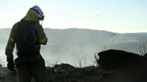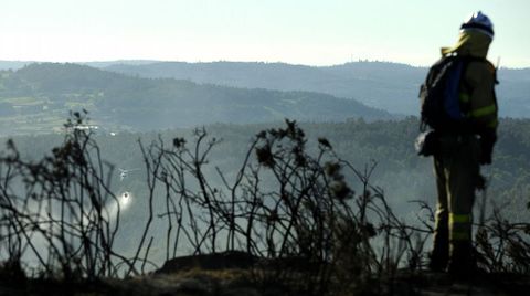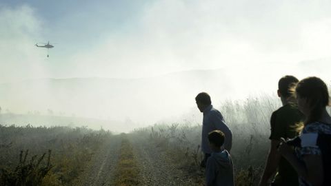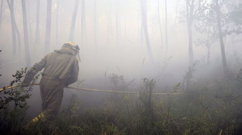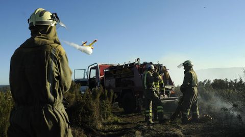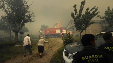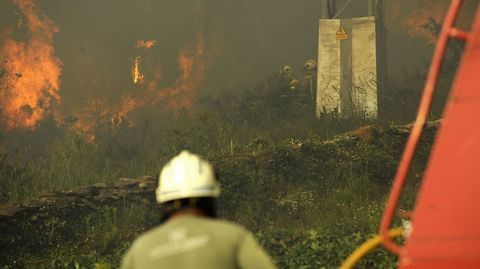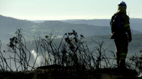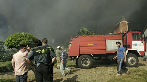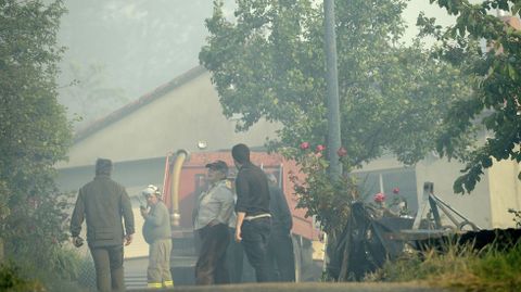 Un cambio en el viento puso en peligro las casas, en Brántega. Los bomberos defendieron con las motobombas la zona impidiendo que el fuego se acercara y evitando ya a esta hora el peligro.