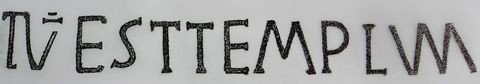 La primera palabra que aparece grabada en la columna esta abreviada, indicando la omisión mediante uno de los signos generales de abreviación consistente en un trazo horizontal colocado encima. Sobre este signo existe otro más corto poco perceptible. Las dos letras de que se compone están enlazadas. En la palabra TEMPLVM las dos últimas letras comparten trazo común, también enlazadas. El texto se halla escrito sin diferenciación de espacios.