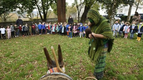 Los niños de la escuela infantil de Donramiro primero y después los del colegio Xoaquín Loriga de Prado disfrutaron ayer de sendas visitas del Xinete das árbores. Anxo Moure dio vida a este personaje salido de las profundidades de los bosques para recordar a los escolares la importancia de defender los bosques y vivir en armonía con el medio natural. Una actividad que se llevó a cabo al aire libre y con las medidas de seguridad en vigor en los diferentes centros educativos. foto Miguel Souto