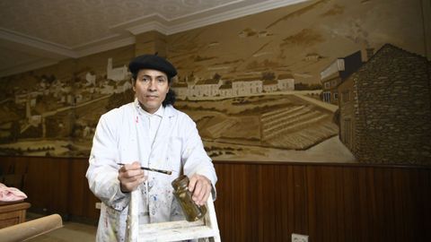 13 ene 2026 . Actualizado a las 05:00 h.En un local hostelero de Donramiro, que reabrirá sus puertas al público en poco tiempo, da los últimos retoques a un mural de grandes dimensiones el pintor Carlos Santos. Una obra donde recrea con detalle