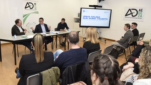 En la sede de la Asociación de Empresarios de Deza (AED) en Lalín el conselleiro de Emprego, Comercio e Emigración, José González, presentó vías de apoyo económico de la Xunta al sector comercial gallego. Acompañado por el regidor, José Crespo, desveló las líneas estratégicas de la consellería para el 2026, con apoyo a la digitalización y la competencia con las plataformas tecnologías. Aludió a las subvenciones para innovación comercial, mejora de la imagen y eficiencia, así como sostenibilidad ambiental, o el papel de los polos de emprendimiento, con uno en Silleda y otro en Lalín. foto adrián freiría