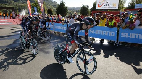 21 ago 2016 . Actualizado a las 05:00 h.Fueron cuatro los equipos que estuvieron desde mediados de semana en Lalín y Silleda, eligiendo Deza para los días previos a La Vuelta 2016 que ayer comenzaba en el balneario de Laias para concluir en Castrelo de Miño, en una contrarreloj por equipos en que Sky Team y Movistar clavaron el crono en 30:37. De los equipos «dezanos», el mejor clasificado fue el Bora-Argon 18, que se situó por encima de la mitad de la clasificación: fueron los novenos en cruzar la meta, con un tiempo que se fue 57 segundos por encima de las primeras escuadras. Por su parte, el Cofidis se situó en la décimo sexta plaza, dejándose 1:34 sobre los primeros. Dos puestos más abajo quedó el equipo AG2R-La Mondiale, que perdió 1:48. La posición más discreta de los conjuntos que tuvieron durante todos estos días la comarca como base de operaciones fue Lotto NL-Jumbo, penúltimo en la clasificación de 22 equipos, que perdió 2:05 sobre Sky Team y Movistar. La Vuelta discurre hoy de Ourense a Baiona . foto santi m. amil