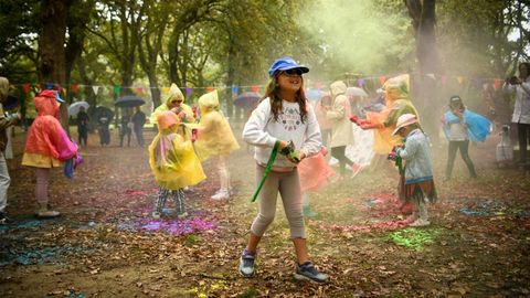 Con impermeables y gafas protectoras, los niños disfrutaron ayer en As Pedrosas de una nueva fiesta holi organizada por el ANPA Raparigos de Silleda y que se celebró igual pese a la lluvia que cayó a ratos. Con protección y el uso de polvos de colores ecológicos y naturales, la fiesta fue pura diversión. foto Miguel Souto