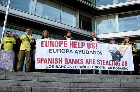 Clientes afectados por las preferentes volvieron a salir ayer a la calle en Vigo para exigir la devolución de su dinero. Son ya 8 meses de movilizaciones regulares que se han ido repitiendo por toda Galicia. En la marcha de ayer, de dos horas por el centro de la ciudad y que se inició en la sede central de Novagalicia y acabó ante las oficinas de la Xunta, los concentrados pidieron ayuda a Europa y denunciaron el «robo» de sus ahorros por parte de los bancos. foto javier castro