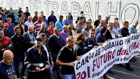 11 oct 2013 . Actualizado a las 19:41 h.Unos 2.500 trabajadores del naval ferrolano salieron ayer a la calle para repetir una marcha en la que durante dos horas recorrieron varias calles de la ciudad y reclamaron más carga de trabajo. La plantilla de Navantia y la de las empresas auxiliares secundaron de forma masiva la convocatoria, aunque no escondieron un cansancio motivado por las malas noticias de esta semana.