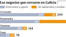 El registro de bajas de autónomos en la Seguridad Social en la actividad de comercio cifra ya en 1.002 los establecimientos que han echado el cierre en la comunidad en los nueve primeros meses del año. Según este balance, el único fiable para poder poner números al hundimiento de este sector, de los 51.657 negocios de venta al público que había registrados en enero seguían en activo 50.655 al acabar octubre, un mes especialmente duro en el que cada día 10 negocios colgaron el cartel de cerrado (277 extinciones). Las ventas no van bien. El índice del sector minorista que elabora el INE (Instituto Nacional de Estadística) registraron una caída del negocio en Galicia del 3,4 % en septiembre, último mes del que hay datos, y en lo que va de año el descenso acumulado es del 0,4 %.