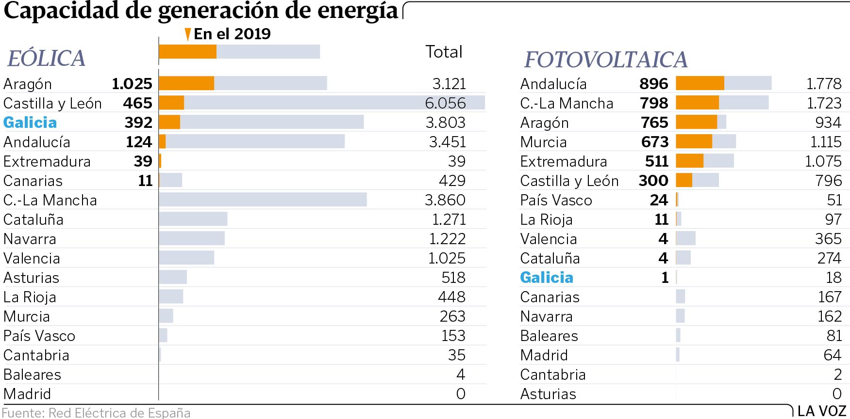 La tecnología solar fotovoltaica ha sido la verdadera estrella del 2019, pues acaparó el 62 % de la nueva potencia renovable instalada. Las comunidades de Andalucía, Castilla-La Mancha y Aragón concentraron buena parte de los megavatios de estreno. En este tipo de tecnología, Galicia pinta más bien poco. En el 2019 se incorporó al parque de generación un solo megavatio, con el que la comunidad suma un total de 18, de acuerdo con los datos oficiales de REE. En agosto pasado entró en operación el parque fotovoltaico de Vilardevós (Ourense), de 1,5 megavatios y 4.500 módulos, el mayor de Galicia. Sus promotores, Fernando Pereira, entre ellos, están tramitando ya una ampliación para contar con otro megavatio más. La inversión rondaría entre 700.000 y 800.000 euros, detalló Pereira.