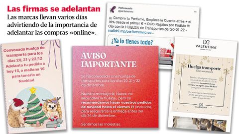 A la vista del colapso que puede acabar provocándose en todo el sistema en caso de que los transportistas decidan continuar con la huelga convocada, las empresas españolas han decidido adelantarse a los acontecimientos. Son muchas las firmas que han avisado estos días a sus clientes del riesgo que corren de quedarse sin sus regalos bajo el árbol en las próximas fechas. A través de correos electrónicos, con mensajes colgados en sus propias páginas web o incluso por las redes sociales, cientos de empresas llevan ya varias semanas advirtiendo de la importancia de no dejar las compras navideñas para el último minuto. Una campaña que, de hecho, se ha intensificado esta semana, a la vista de que las posturas entre patronal y Gobierno seguían muy alejadas. «Se ha convocado una huelga de transportes para los días 20, 21 y 22 de diciembre. Nuestra mensajería no secundará el paro, pero recomendamos hacer vuestros pedidos de Navidad hasta el viernes 17 para asegurarnos la entrega antes del día 24 de diciembre», es uno de los muchos avisos con los que los consumidores se han topado estos días en sus correos electrónicos.