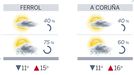 18 dic 2015 . Actualizado a las 05:00 h.Galicia vive esta semana a medio camino entre las altas y las bajas presiones, con días de temperaturas agradables y sin precipitaciones, y otros de lluvias y bajada de las máximas. El 20D estará dentro de estos últimos. José Hierro, responsable del grupo de predicción de la delegación de la Agencia Estatal de Meteorología (Aemet) en A Coruña, explicó que Galicia vivirá en la jornada electoral un pequeño temporal con viento, lluvia y entrada de aire frío. «El anticiclón se situará en el sur de Europa y viene un frente que afectará a la comunidad en la madrugada del sábado al domingo». Tras el paso de las bajas presiones, se producirán dos consecuencias: por un lado, la entrada de aire frío, lo que provocará un desplome de las temperaturas, muy por debajo de los valores alcanzados estos días, y por el otro, chubascos intermitentes.