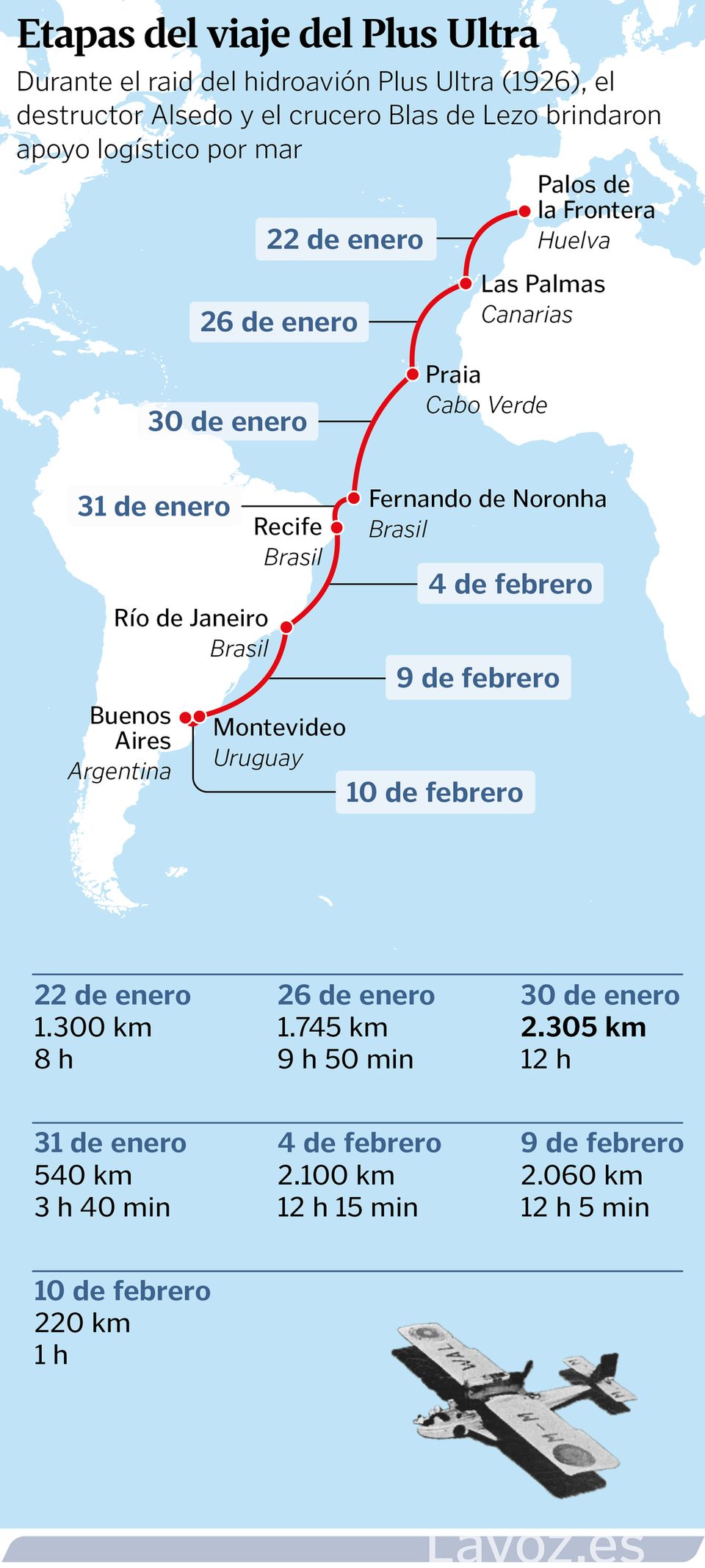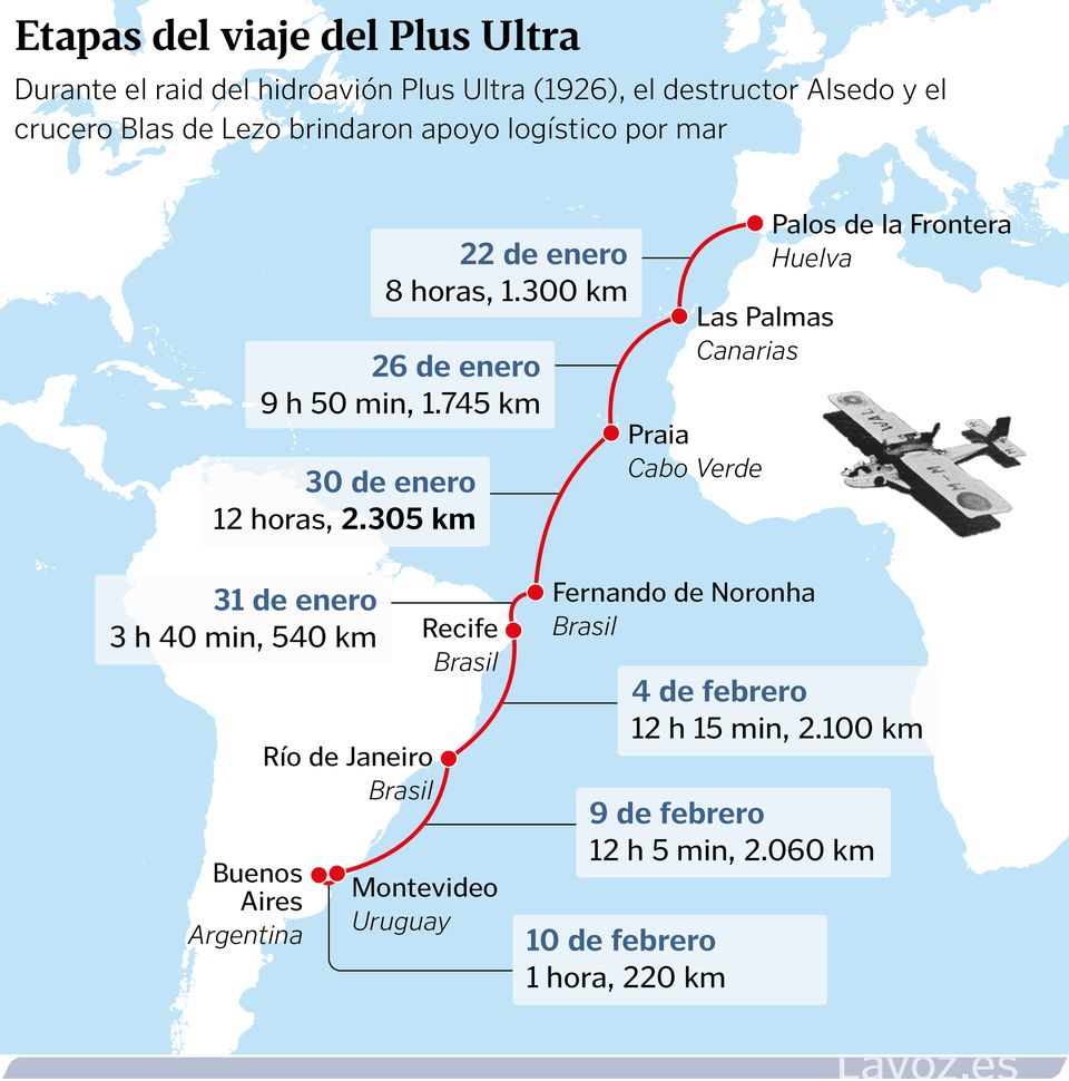 11 feb 2026 . Actualizado a las 10:02 h.Según datos de Eurocontrol, el vuelo más largo que se puede hacer actualmente desde Europa es el directo entre Londres y Perth (Australia) con la aerolínea Qantas. Este hito de la aviación de larga distancia supone algo más de 16 horas de una tacada para recorrer unos 14.500 kilómetros. ¿Qué pensarían los pasajeros si supieran que hace 100 años hicieron falta más de 59 horas repartidas en ocho etapas que tardaron en cubrirse casi 20 días para recorrer 10.270 kilómetros? Pues sí, este es el hito que protagonizó en 1926 un hidroavión de la Aviación militar española llamado Plus Ultra. Parece justo, pues, dedicar un recuerdo a sus cuatro tripulantes: el comandante Ramón Franco —hermano del Francisco que luego fue dictador de España durante casi 40 años—, el capitán Julio Ruiz de Alda, el teniente de navío Juan Manuel Durán y el sargento mecánico Pablo Rada; y a su hazaña, que los lectores de La Voz pudieron seguir con todo lujo de detalles hasta justo el 11 de febrero de aquel año, cuando el «gallardo vuelo del Plus Ultra de Montevideo a Buenos Aires» ocupó las dos primeras de las ocho páginas del periódico ese día.