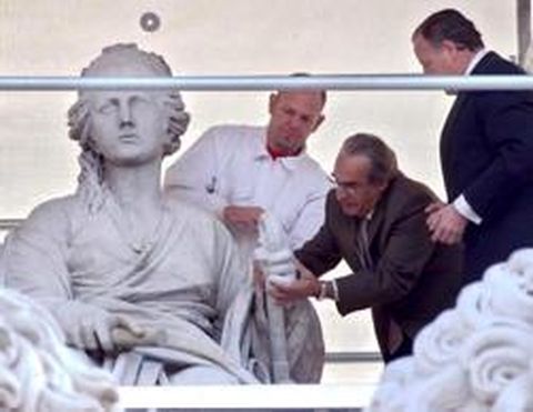 06 nov 2002 . Actualizado a las 06:00 h.La diosa Cibeles recuperó ayer la mano izquierda que le cercenaron unos jóvenes ebrios hace un mes y medio. La gamberrada, al margen del daño artísitico causado a la emblemática estatua, le va a costar a los madrileños 30.000 euros. El alcalde de Madrid, José María Álvarez del Manzano, quiso hacerse ayer la foto reponiendo la pieza desprendida, que incluye la llave de la ciudad que sostiene la diosa. Acompañado del concejal de Rehabilitación, Sigfrido Herráez, y del orfebre que realizó la réplica, José Luis Parés, Manzano subió al andamio que ha ocultado durante este tiempo la imagen de la Cibeles para observar de cerca la reposición del apéndice. Preguntado por sus sentimientos al acercarse a la escultura, el alcalde aseguró que en esos momentos recordaba «que soy del Betis». Pese a la perfección de la nueva mano, tanto el autor como el alcalde dejaron clara su intención de que se aprecie claramente que se trata de un duplicado. Así, la mano lleva la inscripción R-2002 y las juntas no se han repasado. Deben notarse para que se vea que «se trata de una pieza añadida que no pertenece al monumento original», según explicó Manzano. También la derecha Del enorme bloque de piedra cedido por el Ayuntamiento de Montesclaros (Toledo) para la réplica han sobrado tres piezas que han sido almacenadas en previsión de futuros desperfectos. El autor de la reparación ha tomado también un molde de la mano derecha por si fuera necesaria. Los responsables municipales se refirieron a los autores de los destrozos y propusieron que se les aplique un «castigo ejemplar» y el edil consideró que no basta con que paguen los gastos. «Deberían obligarles a limpiar todos los sábados las pintadas de la ciudad», añadió Herráez. Álvarez del Manzano confirmó también que no habrá vigilancia especial para esta estatua «porque en Madrid hay más de mil monumentos y no vale poner un policía delante de cada uno». Para decepción de los curiosos, la Cibeles volvió a cubririse tras el acto. Sólo podrá volver a contemplarse dentro de unos días, cuando la mano esté firmemente pegada al brazo.