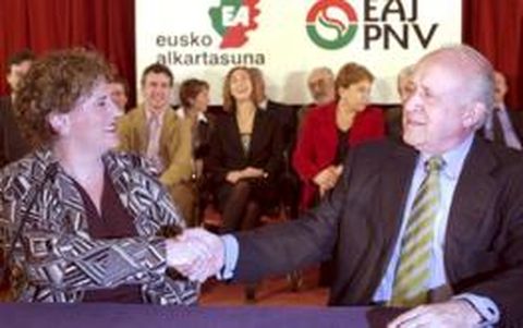 09 mar 2003 . Actualizado a las 06:00 h.PNV y EA suscribieron ayer en Bilbao el acuerdo por el que concurrirán en coalición a las elecciones municipales y forales del próximo 25 de mayo. Los presidentes de ambos partidos, Xabier Arzalluz y Begoña Errazti respectivamente, subrayaron que el pacto va más allá de la cita electoral y que tiene una misión «patriótica y soberanista», en respuesta a las «agresiones» del Gobierno. En su opinión, el Ejecutivo central estaría estudiando la posibilidad de «burlar su Constitución» y suspender los comicios del País Vasco, «lo que dejaría en manos de ETA la suerte de este pueblo». El presidente peneuvista denunció el intento de «eliminación» de Batasuna. «Haremos todo lo posible para que eso no suceda», dijo Arzalluz. Ante este supuesto escenario, señaló que «ojalá» la coalición aberzale encuentre la fórmula para que sus votantes estén representados. El líder nacionalista advirtió al Gobierno central de que «cada vez que han querido enfrentarse a los vascos, Madrid siempre ha salido perdiendo y el nacionalismo ha ganado». PNV y EA compartirán listas en 120 municipios del País Vasco y Navarra, en las Juntas Generales de Álava, Vizcaya y Guipúzcoa y en el Parlamento Foral Navarro, y concurrirán sobre un programa común.