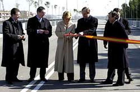 La presidenta de la Comunidad de Madrid, Esperanza Aguirre, y el alcalde de la capital, Alberto Ruiz-Gallardón, inauguraron ayer la segunda fase de la Gran Vía de Villaverde, una infraestructura que tiene una longitud total de 3,1 kilómetros y que ha supuesto una inversión del Gobierno regional de 91,7 millones de euros. Los nuevos 1.500 metros de vía dan como resultado una gran avenida que discurre sobre las vías del tren, uniendo las estaciones de Renfe de Villaverde Alto y Villaverde Bajo. En la imagen, Aguirre corta la cinta en la inauguración.