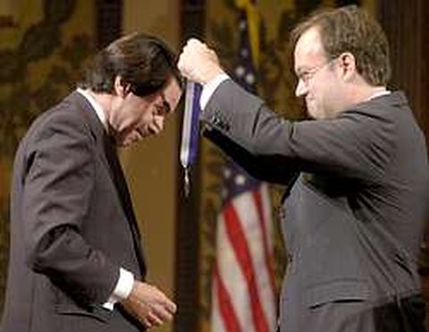 21 sep 2004 . Actualizado a las 07:00 h.Seis meses después de dejar la presidencia del Gobierno en circunstancias muy distintas a las previstas, José María Aznar debutó ayer en su nueva faceta de profesor universitario. El «distinguido especialista en el ámbito del liderazgo internacional», como denomina la Universidad de Georgetown (Washington) a su fichaje, dictó ayer su primera conferencia, que versaba sobre un tema especialmente doloroso para él. «Siete tesis sobre el terrorismo de hoy» fue el título de la lección inaugural del curso del ex presidente español, que forma parte de un seminario al que asisten una veintena de alumnos. Cada uno de ellos ha pagado cerca de 40.000 dólares por el año completo, en el que los cursos en los que participa Aznar son sólo una parte del programa. La universidad, que no paga igual a todos los profesores que contrata, ha declinado informar sobre el sueldo que cobrará el ex presidente. Página web propia La conferencia de ayer era abierta al público pero la página web que la universidad ha creado para Aznar (http://president.georgetown.edu/aznar/) indicaba desde hace tiempo que el aforo estaba completo. En esa página se afirma que Aznar entró en política a finales de los 70 (se afilió a AP en 1979) y que lidera el PP desde 1987. Lo cierto es que en ese año el PP ni siquiera existía; que Aznar sólo fue candidato en 1989 y sólo asumió la presidencia, sucediendo a Manuel Fraga, en 1990. Aznar, que ayer coincidió en EE.UU. con Zapatero, que asistía la asamblea de la ONU en Nueva York, y con Felipe González, que daba una conferencia en una universidad de Los Ángeles, tendrá cuatro estancias de una semana en Georgetown durante dos semestres. Además de esta visita, estará entre el 8 y el 12 de noviembre; del 31 de enero al 4 de febrero del 2005 y del 4 al 8 de abril de ese año. Durante ese tiempo impartirá seminarios y moderará coloquios, siempre en castellano, sobre política europea contemporánea y relaciones transatlánticas. En el año 2001 el Gobierno del PP suscribió un convenio con la Universidad de Georgetown por el que se destinaron 1,9 millones de euros a becas de licenciados españoles en ese centro entre el 2002 y 2005. En enero del 2004 Aznar recibió la Medalla del Presidente de la Universidad de Georgetown por su contribución a la mejora de las relaciones entre España y Estados Unidos.
