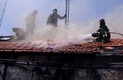 A primera hora de la tarde de ayer se produjo un violento incendio en una buhardilla del número 42 de la calle Olivar, en Lavapiés. El fuego comenzó en torno a las 13.30 de la tarde en una de las buhardillas del inmueble y desde allí se extendió a las viviendas colindantes, arrasando dos de los tres apartamentos del último piso, así como la cubierta del edificio, que era de madera. Dos dotaciones de bomberos (en la imagen varios operarios) tardaron 25 minutos en apagarlo.