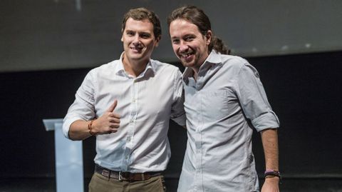 01 abr 2016 . Actualizado a las 05:00 h.Quedaban aún dos meses para las elecciones. Pablo Iglesias y Albert Rivera, los líderes de las dos formaciones emergentes surgidos de los platós de televisión, mostraban su cercanía en el programa Salvados. Ambos en mangas de camisa, desenvueltos, sonrientes. En el test que les hizo Jordi Évole, estuvieron de acuerdo en derogar la ley mordaza, pagar los atrasos a los dependientes, obligar a la Iglesia a abonar el IBI o no financiar a las escuelas que segregan por sexo. Esto hizo que el secretario general de Podemos le dijera al presidente de Ciudadanos en tono de broma: «Como esto siga así nos presentamos juntos a las elecciones».