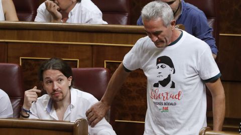 Los escaños de la formación de Pablo Iglesias y sus confluencias han repetido parte del espectáculo de la pasada sesión constitutiva, pero sin tanto ruido