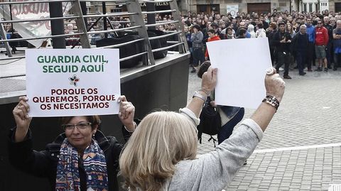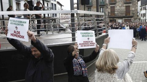 La hermana de Gregorio Ordóñez, el concejal del PP en San Sebastián asesinado por ETA en 1995 de un tiro en la nuca, ha denunciado este «discurso del odio» cuando se cumplen cinco años de que la banda terrorista anunciara el cese de la actividad armada. «No os tenemos miedo», «Guardia Civil, seguid aquí» o «sin pistolas no sois nada» han sido algunos de los lemas que han portado los miembros de Covite. «Hemos venido a dar la cara y a enfrentarnos a los radicales que quieren imponer el miedo y el odio en Alsasua y en muchos otros pueblos como éste». «Aunque ETA ya no mata, los radicales siguen armados mentalmente y dispuestos a ejercer una violencia que ellos pueden enmascarar como una pelea de bar, pero que nosotros llamamos terrorismo», ha expuesto Ordóñez.