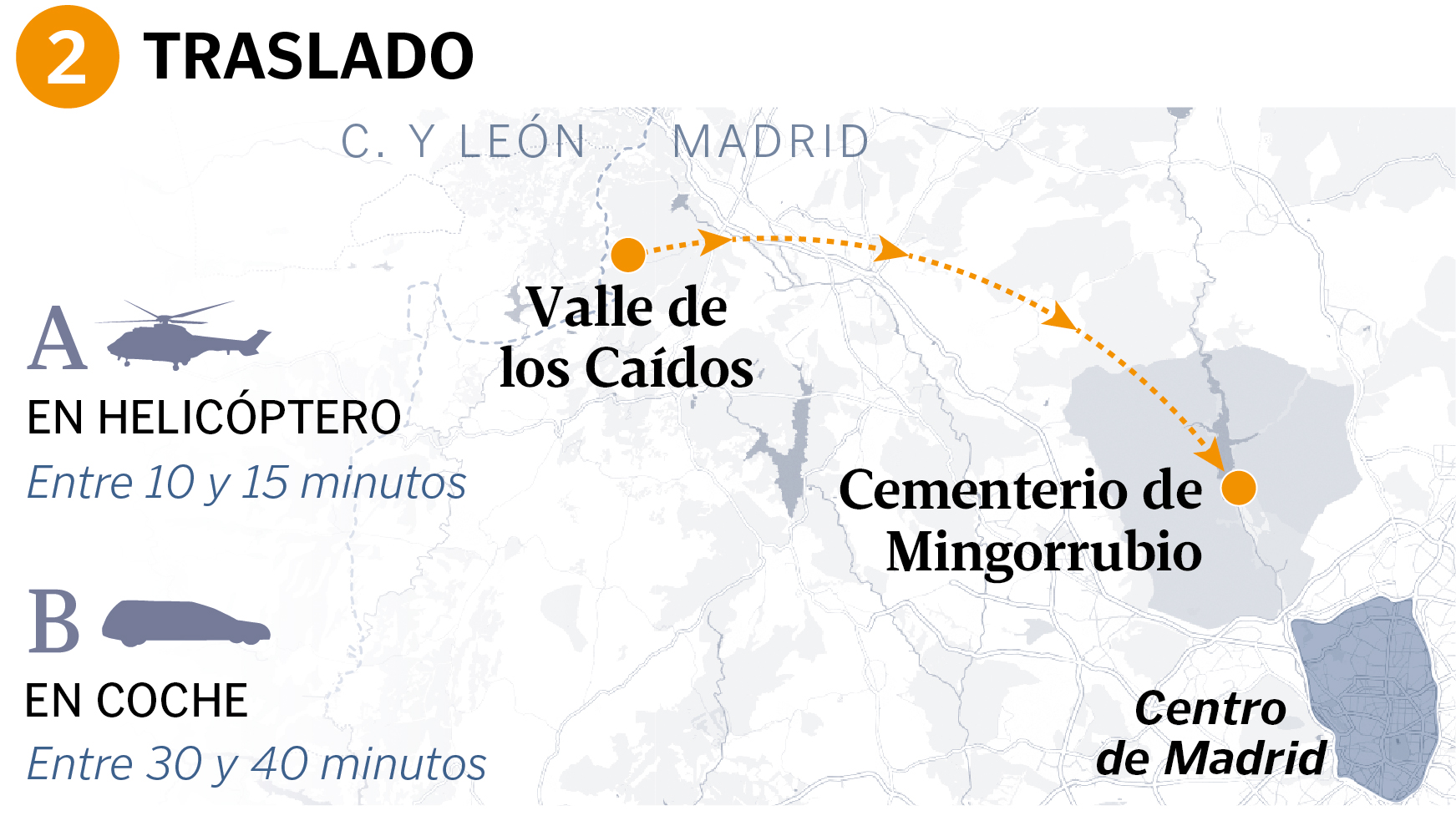 Una vez extraída la caja, hay dos opciones en función de las condiciones atmosféricas. Si son favorables, se podrá efectuar en helicóptero, pero si hay mucha niebla o viento tendrá que hacerse en coche. La lluvia no sería motivo para descartar la primera opción. La de mover los restos por aire es la opción más deseable ya que supondría un menor despliegue y sería más segura y rápida que la vía terrestre.