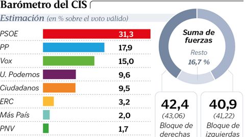 A solo 2,9 puntos del PP. El más beneficiado en la encuesta es Vox, que no solo consolida su tercera plaza a nivel nacional, sino que pisa ya los talones al PP, según el centro demoscópico dirigido por el socialista José Félix Tezanos. El partido de Santiago Abascal lograría un 15 % de los votos, con un incremento de 1,4 puntos respecto a las estimaciones de febrero. Un salto que le sitúa a solo 2,9 puntos del PP y que reflejaría una lucha abierta entre ambas fuerzas por hacerse con la hegemonía de la derecha tras la ruptura de los populares expresada en el Congreso durante el debate de la fallida moción de censura presentada por Abascal.