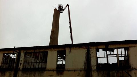 La demolición del conjunto fabril se ha iniciado por la chimenea, cuya conservación, junto a las oficinas del conjunto, había sido solicitada por el Colegio de Arquitectos de Galicia.