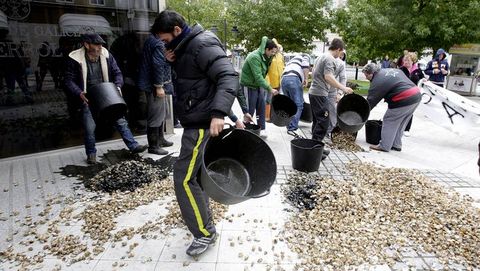 02 nov 2012 . Actualizado a las 15:51 h.Un grupo de mariscadores de las cofradías de Ferrol y Barallobre se desplazaron sobre la una de la tarde a las inmediaciones del edificio administrativo de la Xunta, junto a la plaza de España, para tirar en la zona almeja muerta procedente de las bateas a modo de protesta por el mal funcionamiento de ese sistema de depuración.