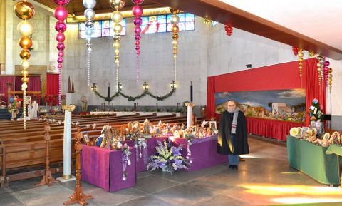 «El culmen (de los regalos de nacimientos) llegó cuando me consagré a Dios como diácono, y ya el colofón, cuando me ordené como sacerdote», explica. La mayor parte de los belenes bíblicos que forman su colección privada se puede ver en la iglesia de Nuestra Señora de la Luz, en el poblado de As Veigas, en As Pontes, hasta el domingo, de 11.30 a 13.30 horas y de 16.30 a 18.30. Y desde el 12 hasta el 2 de febrero, con visitas programadas a través de la parroquia. La muestra se divide en tres partes: «En la primera está la vida de Jesús antes de su nacimiento (...), y termina con la plenitud del nacimiento; en la segunda, Santa Teresa de Jesús acompañada de niños Jesús, todos con una advocación; y la tercera, el mundo infantil, en el altar mayor, con un belén a tamaño natural». Casi todos los belenes han sido adquiridos en distintas provincias españolas, pero también hay piezas procedentes de Portugal, Venecia, Argentina, México o Roma. Ares Fernández agradece el apoyo de sus compañeros y ayudantes de la parroquia de As Pontes y, de manera especial, la ayuda del ribadense Juan Estévez Monteavaro.