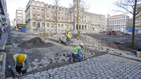 Los trabajos se centran ahora en la recolocación de los adoquines de las calles perimetrales