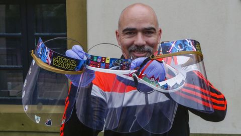 Antes de ponerse manos a la obra con las pantallas faciales de talla infantil, Ahitor Regueiro fabricó 1.500 unidades destinadas a policías, trabajadores de residencias de mayores y otros colectivos muy expuestos al virus. «La semana más intensa fue la anterior a la Semana Santa, cuando el ritmo de producción estaba entre 100 y 120 protectores al día», rememora. Pero el profesor no estuvo solo en esta tarea. Según explica él mismo, contó con el apoyo de la Escuela Universitaria de Diseño Industrial (EUDI), que corrió con los gastos de las gomas y las láminas de acetato que hay que incorporara las viseras para producir las máscaras; la colaboración de las empresas Equifer y 2K Systems, que suministraron gratuitamente distintos materiales; y la ayuda de Elo Rey Gómez, secretaria del director de la escuela, que logró un permiso especial para poder circular y distribuir las pantallas por distintos municipios de la comarca.