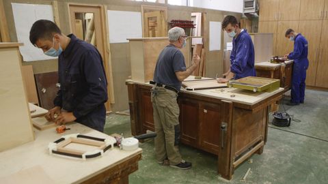 Ni el profesor José Vidal ni sus alumnos de carpintería tendrían que acudir al taller del centro del CIFP Ferroltera, pero allí se encuentran dos días por semana. «Yo tengo más de 60 años, así que no tendría la obligación de estar aquí, pero lo hago por los alumnos, en oficios como este tenemos que volver, los carpinteros no se hacen por Internet, necesitan el taller y trabajar con la madera aquí», cuenta mientras guía a los alumnos en el montaje de un mueble. Casi todos han estado dos meses sin tener una herramienta en la mano. «Yo quiero terminar las prácticas, no dejarlas para más adelante porque el año que viene quiero entrar en el ciclo de mobiliario para embarcaciones deportivas», detalla Francisco Bouza, un naronés de 18 años que está en segundo curso del ciclo medio de carpintería. Francisco comparte con el resto de sus compañeros de clase la preferencia por las aulas prácticas frente a las teóricas, con las que siguen de forma telemática dos veces por semana, aunque lo que 0más les interesa es alcanzar la parte de la formación en la que los envían a las empresas. «Ese es el objetivo de la mayoría de estos chavales, que los conozcan en las fábricas de la comarca y aprender en un escenario real de trabajo, es el perfil de los alumnos que nos llegan», cuenta el profesor de una clase que ayer se afanaba por terminar un mueble con cajones como si el cliente estuviese esperándolo con ansia. Por eso confiesan: «Teníamos muchas ganas de volver».
