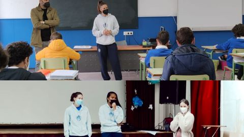 Tras su brillante temporada invictas en la liga femenina dos de Baloncesto y el consiguiente ascenso a la máxima categoría del baloncesto, la liga Endesa, las jugadoras del Universitario Baxi Ferrol se han convertido en unas auténticas heroínas en la ciudad. Por ello, el alumnado de tercero de ESO y de quinto de primaria del colegio Compañía de María de Ferrol quiso contar esta semana con una representación del BAXI Ferrol. Por el centro pasaron el martes las jugadoras Patricia Benet, Laura Fernández, y Dynn Leaupepe, así como el entrenador del equipo, Lino López. La representación del Baxi participó en una actividad en la que los alumnos del colegio tuvieron la oportunidad de plantearles infinidad de preguntas sobre su trayectoria profesional, personal y otras curiosidades. Además, quisieron entrevistar en inglés a la californiana de origen samoano Dynn Leaupepe, aprovechando así la ocasión para poner en práctica sus conocimientos en idiomas. Tanto las jugadoras, como el entrenador y también profesores y alumnos participantes en la actividad quedaron encantados con la visita. Además el colegio celebra hoy el English Day con actividades y juegos en inglés en todos los cursos.